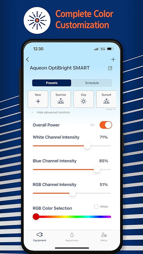 - Dims in 1% increments for white, blue and color LEDs separately for complete color customization