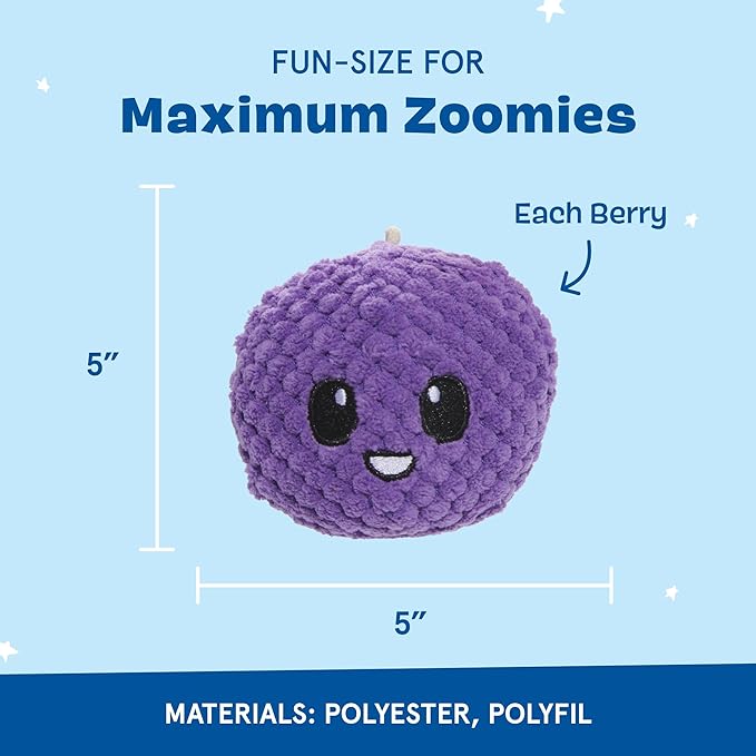 - Three Toys in One: This 3-in-1 dog toy is great for families with multiple dogs (or one very spoiled one)! Toss these squeaky berries for a never-ending game of fetch.