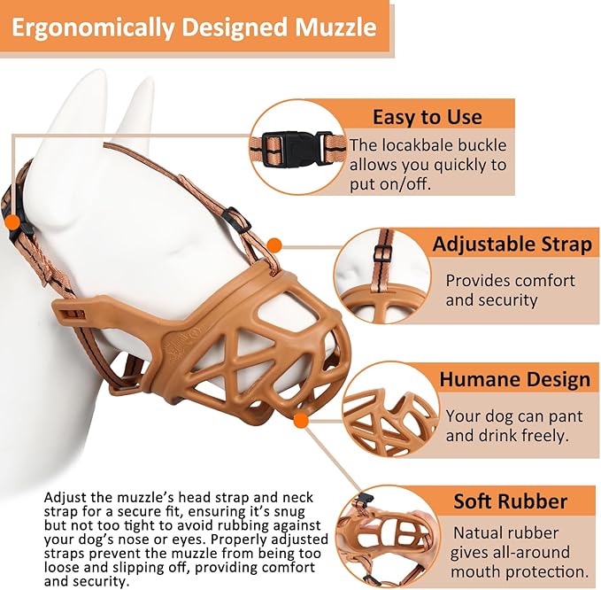 - The Only Muzzle You Need: Say goodbye to your old muzzle. The BARKLESS practical muzzle has features you need to prevent your dog from nipping, destroying, fighting and digging and eating everything while the basket-style design gives all-around mouth protection allowing your pet unrestricted drinking and panting. This muzzle for dogs make it the ideal choice for reactive dogsβ daily walks, occasional use, dog park socialization, grooming, vet visits, training, traveling, and walking