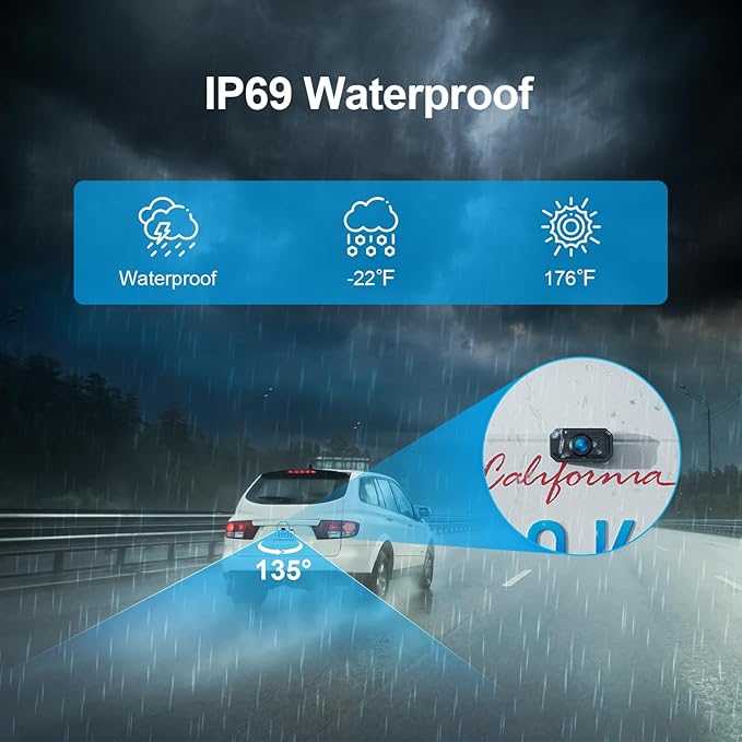 - IP69 Waterproof Liscent Plate Camera: The housing of license plate camera is made of ABS+PC metal raw material. Featuring with IP69 waterproof rating, it is more heat resistant and less likely to bend or break, which is able to work perfectly and provide clear images in extreme environments from -22Β°F to 176Β°F. It can tenaciously resist the baptism of wind, rain, dust, enhancing the safety index and service life