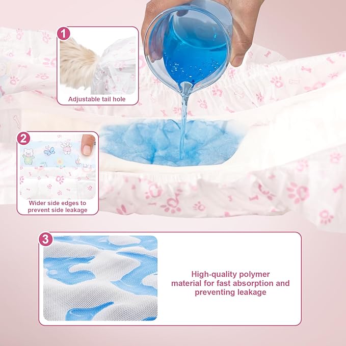 - SUPER ABSORBENT FEMALE DOG DIAPERS :The fully absorbent diaper has a 360-degree leak protection barrier, and a super absorbent core to prevent any unnecessary leaks, keep the dog comfortable and dry