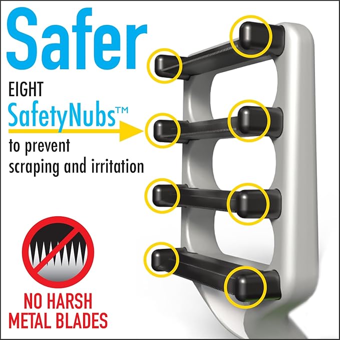 - Safer: Eight SafetyNubs prevent scraping and damage to your pet’s skin. Unlike other cat deShedding tools that use harsh metal blades, FUR4 uses an advanced composite carbon fiber for a safer deShedding experience.
