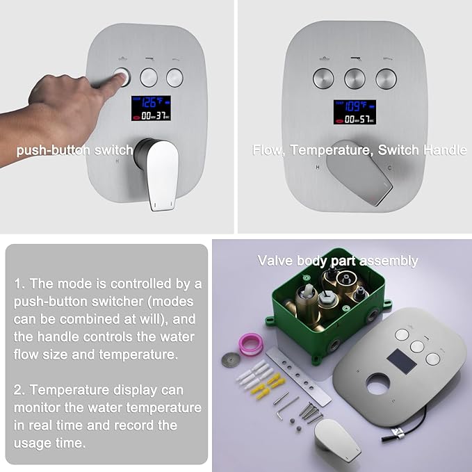 - Temperature digital display(no power or battery required): rain shower system design update, shower valve uses a hydro generator, built-in LCD digital temperature display(Β°F), easy to monitor temperature