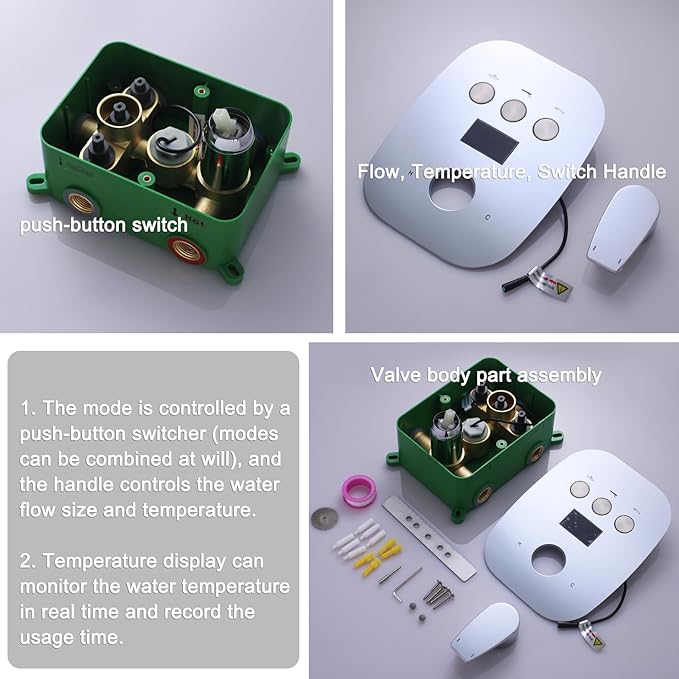 - Temperature digital display(no power or battery required): rain shower system design update, shower valve uses a hydro generator, built-in LCD digital temperature display(Β°F), easy to monitor temperature