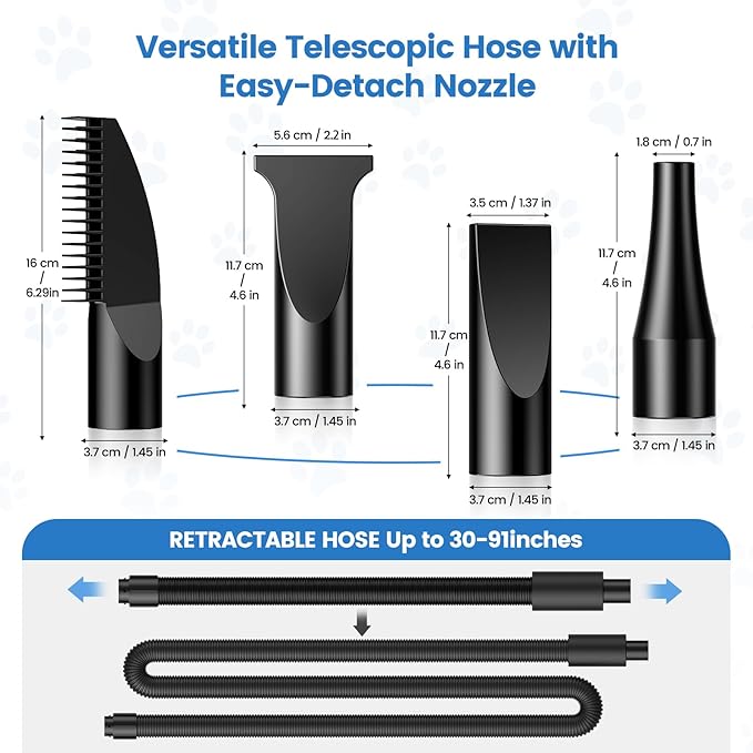 - Low Noise & Heat Insulation - Pet-Friendly: The thickened inner barrel reduces noise levels by 10-20 decibels compared to similar models and enhances heat insulation, making it safe for extended use. The insulated hose handle ensures comfortable handling, protecting your hands from heat during long grooming sessions.