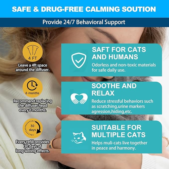 - Cat Calming Diffuser: This cat pheromones diffuser kit use newly upgraded diffusion technology to bring effective calming pheromones to cats and relieve stress. This is a simple and effective cat pheromone solution to make your cat happier and more relaxed