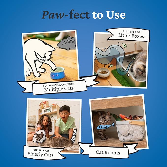 - Ideal Litter Box Deodorizer: When placed within 3’ of your cat’s litter box, you can expect the sharp, sour, or powdery stench accompanied by a well-used litter box to become unnoticeable.