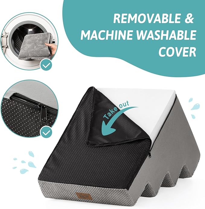 - Non-Slip Base and Removable Cover: Our dog steps for beds are equipped with a non-slip base featuring rubber dots for extra grip, minimizing movement during use. The pet steps cover is waterproof inner side, so you donβt have to worry about stains seeping into the foam. The outer cover is removable and machine washable for easy cleaning