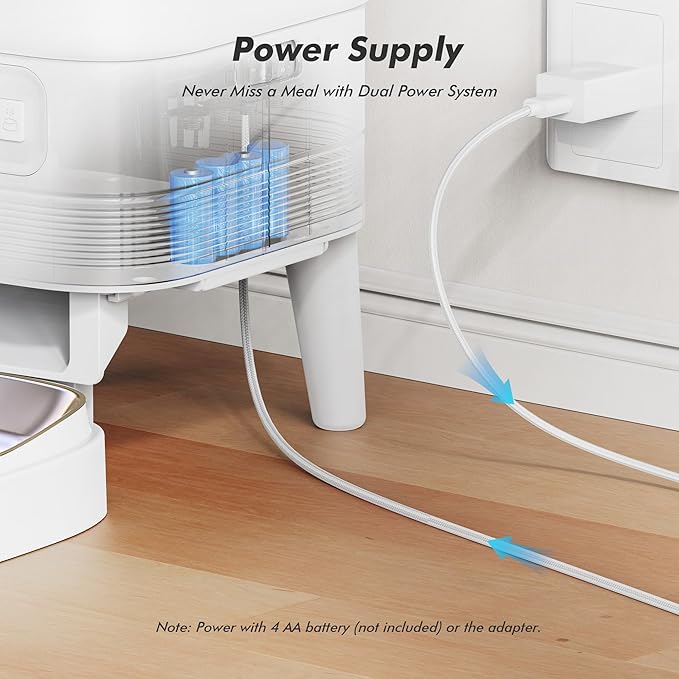 - Dual Power Supply: Powered by either a Type-C adapter or 4 AA batteries (not included), this automatic feeder keeps meals coming even during power outagesβso your pet never goes hungry. It also includes a durable, chew-resistant 1.5-meter nylon cable for flexible and worry-free placement.
