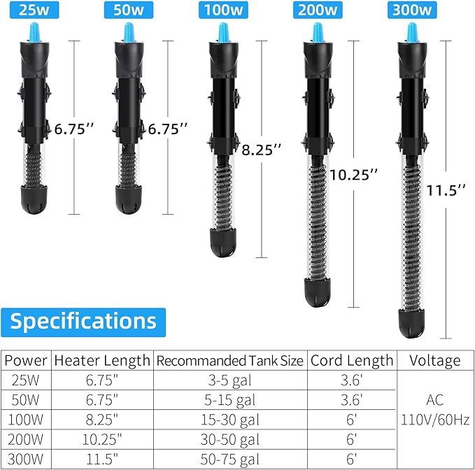 - Ideal for 40-75 gallon Fish Tank: This 300W aquarium heater (11.5" length) with 6ft power cord (110-120V/60Hz) efficiently maintains ideal water temperature for both marine and freshwater aquariums