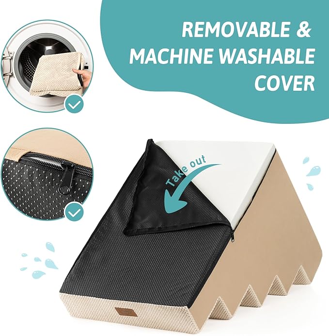 - Non-Slip Base and Removable Cover: Our dog steps for beds are equipped with a non-slip base featuring rubber dots for additional grip, minimizing movement during use. The pet steps cover is waterproof on the inner side, so you donβt have to worry about stains seeping into the foam. The outer cover is removable and machine washable for easy cleaning