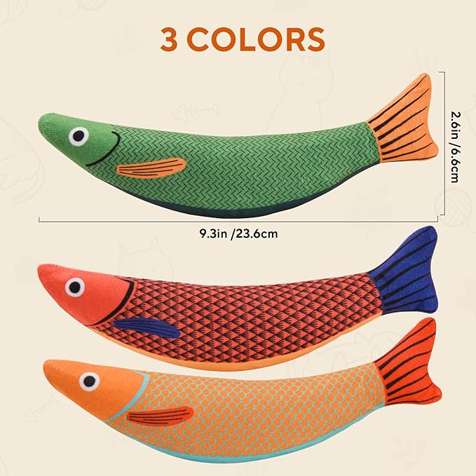 - [Unique Fish Design] These 3 catnip fish toys are designed into 3 bright colors which conforms to the cats’ preference. Each fish measured 9.3*2.6 inch(23.6*6.6cm) size which is perfect for indoor cats kicking. Crinkle paper and catnip inside can entertain your feline friends.
