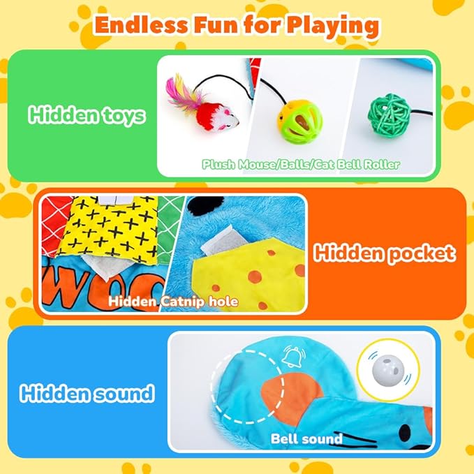 - Hidden toy pocket design: Each pocket comes with catnip that cats are interested in and different types of toys for your cat to explore.Helping reduce your pets' boredom and separation anxiety by killing time with the chew toy and the catnip toys for cats are ideal for cats to play indoor or outdoor.