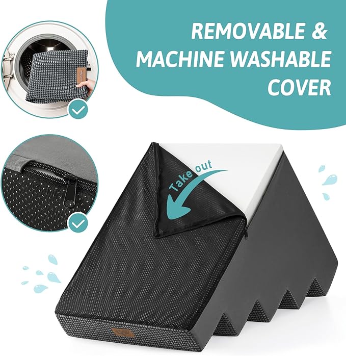 - Non-Slip Base and Removable Cover: Our dog steps for beds are equipped with a non-slip base featuring rubber dots for additional grip, minimizing movement during use. The pet steps cover is waterproof on the inner side, so you donβt have to worry about stains seeping into the foam. The outer cover is removable and machine washable for easy cleaning