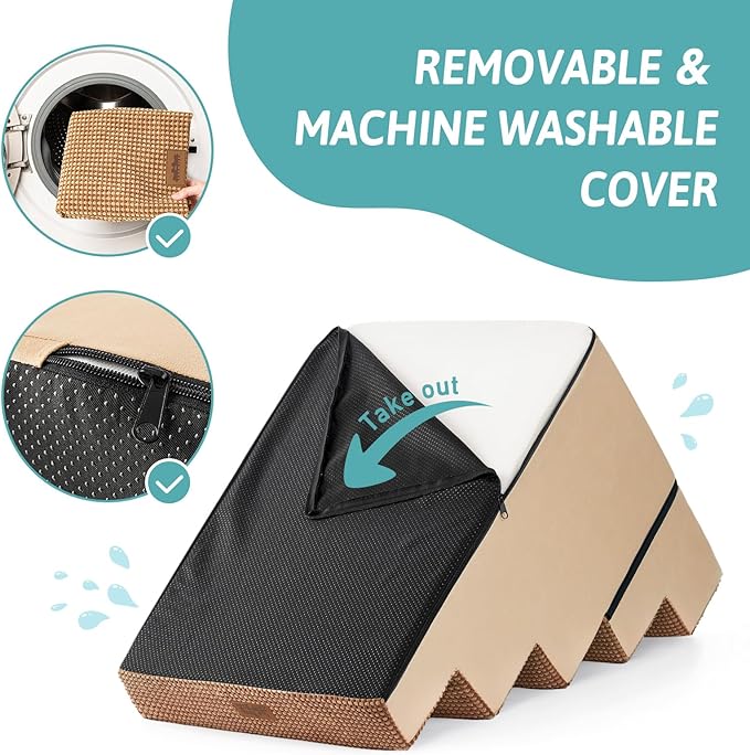 - Non-Slip Base and Removable Cover: Our dog steps for beds are equipped with a non-slip base featuring rubber dots for extra grip, minimizing movement during use. The pet steps cover is waterproof on the inner side, so you donβt have to worry about stains seeping into the foam. The outer cover is removable and machine washable for easy cleaning