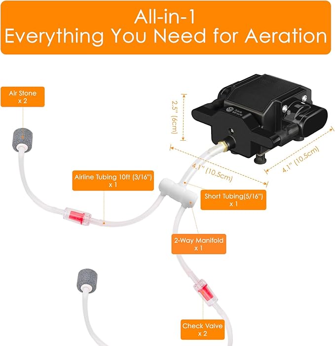 - ALL-IN-ONE PACKAGE - This aerator pump includes everything you need for effective water aeration, including a 2-outlet manifold, check valves, airline tubing, and air stones.