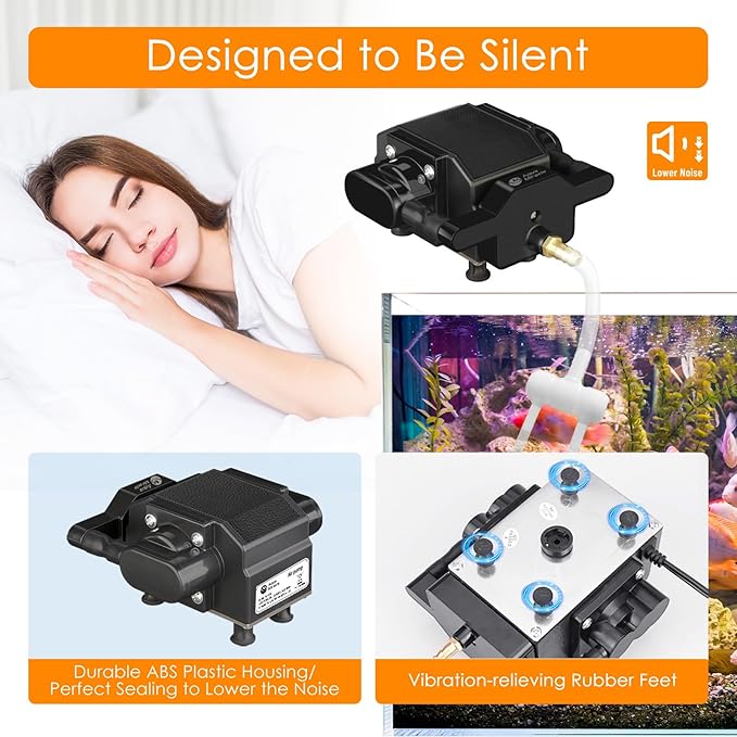 - QUIET OPERATION - Designed to be compact and silent, this fish tank air pump boasts a durable ABS plastic housing, advanced rubber diaphragm, and rubber vibration-relieve feet. The perfect sealing and multiple denoising structural considerations ensure a noise-free experience.
