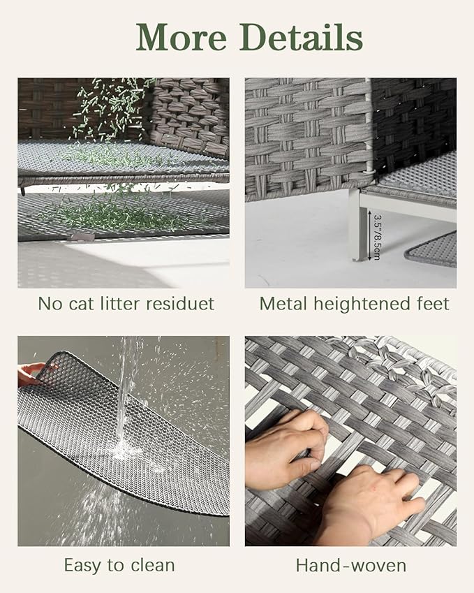 - Solid and Stylish : The cat box furniture has a strong metal frame inside, making the cat box enclosure strong and durable. Handwoven cat litter box cover is stylish and durable that cat litter box enclosed gives cat a place to do his business in private