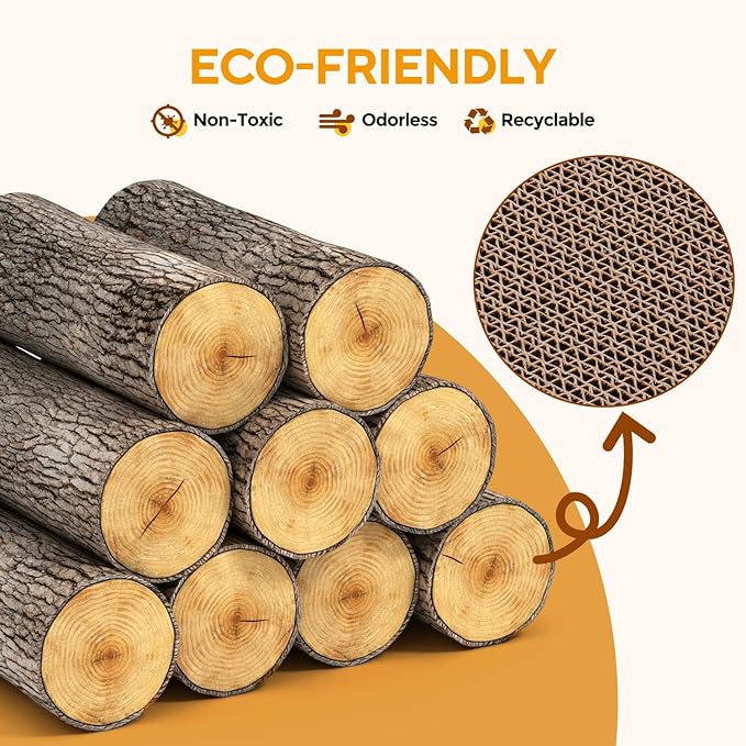 - 【High-quality & Eco Friendly】 The cardboard cat scratcher is made with high-density and abrasion-resistant corrugated paper, which is tough enough to satisfy your cat’s natural scratching instincts while protecting furniture from damage. The 100% Eco-Friendly and non-toxic materials also ensuring safe paws and worry-free play.