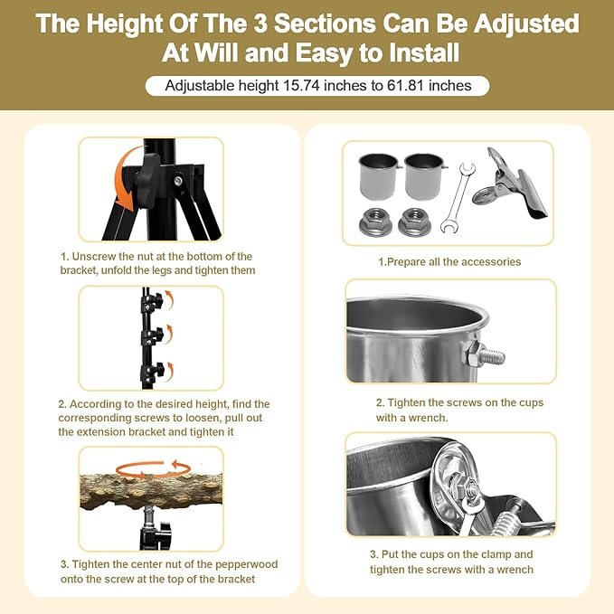 - Metal Structure: The bracket part of the parrot perch is mde of high-quality metal and high-quality plastic, which is sturdy and durable, the bird perches swood pole is made of natural pepper wood