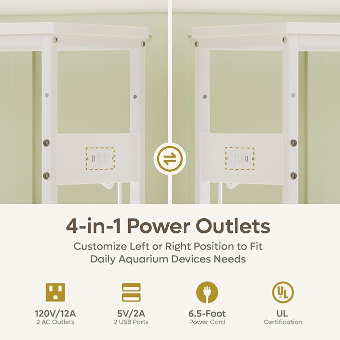 - 4-in-1 Power Outlets: The 29 gallon fish tank stand includes 2 AC and 2 USB outlets, installable on either side for flexible cable management, ideal for powering filters, lights, heaters, and charging devices