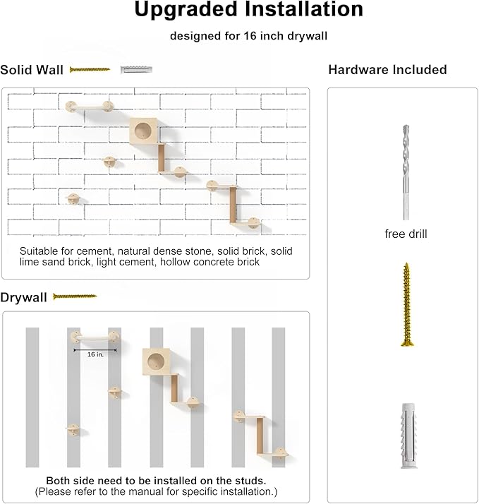 - Easy Installation - The cat wall climber is compatible with 16-inch full-stud mounting for drywall and solid walls, and it comes with all the necessary hardware and thorough instructions for easy installation.