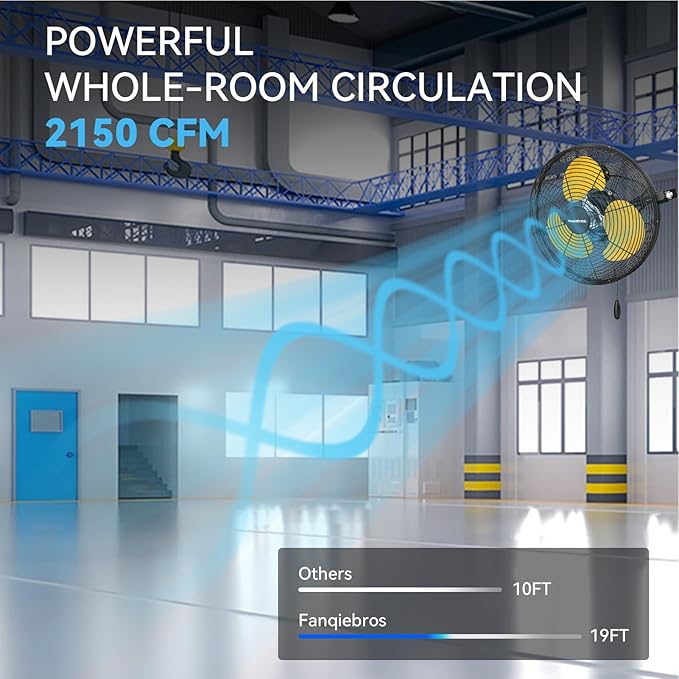 - 𝐇𝐢𝐠𝐡 𝐕𝐞𝐥𝐨𝐜𝐢𝐭𝐲 𝐀𝐢𝐫 𝐅𝐥𝐨𝐰 - Equipped with 3 adjustable wind speeds, low (1700CFM), medium (2100CFM) and high (2500 CFM), this wall fan utilizes the raw power of the pure copper motor to provide hurricane-like airflow to meet your garages, shops, covered patios, or anywhere else you need