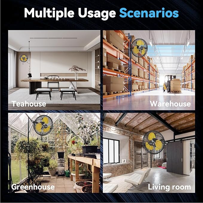 - 𝐋𝐨𝐰-𝐍𝐨𝐢𝐬𝐞 𝐃𝐞𝐬𝐢𝐠𝐧 - The black heavy-duty wall fan operates at a high speed of 9500 CFM with a noise level of only 65dB, which is lower than the industry standard, creating a quieter gathering or working environment