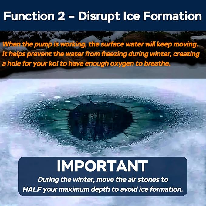 - DUAL-FUNCTIONAL - This versatile pond air pump serves a dual purpose. Not only does it work as a pond aerator, but it also helps prevent ice formation in the cold winter months. By creating a ventilation hole, it allows your koi to breathe and ensures their well-being even in colder temperatures.