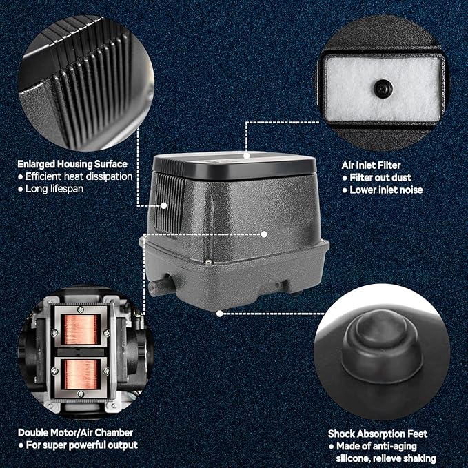 - SPECIFICATION - This linear air pump delivers a max of 1600GPH powerful airflow at 0.035MPa pressure with an 60W energy-efficient copper coil motor that runs in stable operation and lasts longer. Perfect as a pond aerator, septic aerator, hydroponic air pump, or aquarium air pump, it provides high efficiency, low heat and low power consumption.