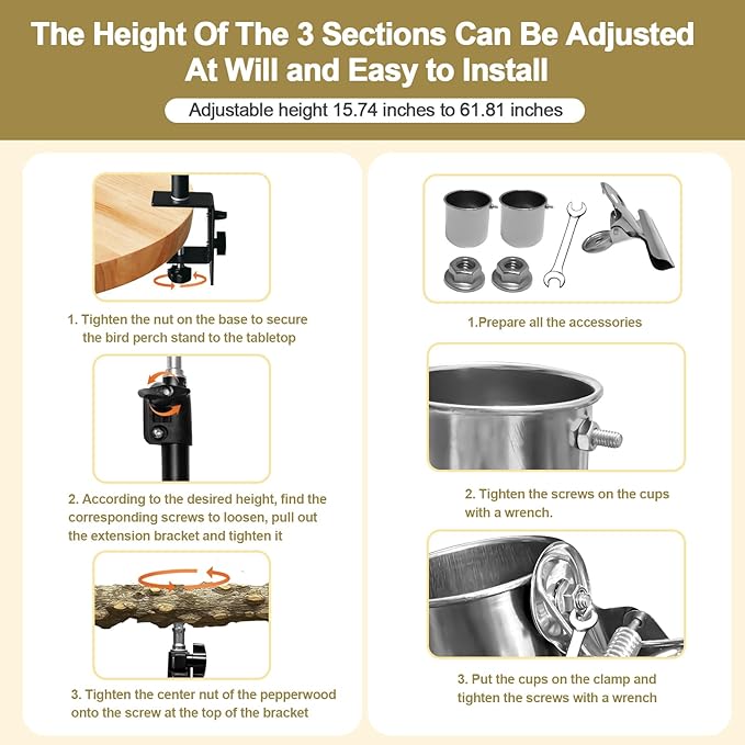 - Metal Structure: The bracket part of the parrot perch is mde of high-quality metal and high-quality plastic, which is sturdy and durable, the bird perches swood pole is made of natural pepper wood