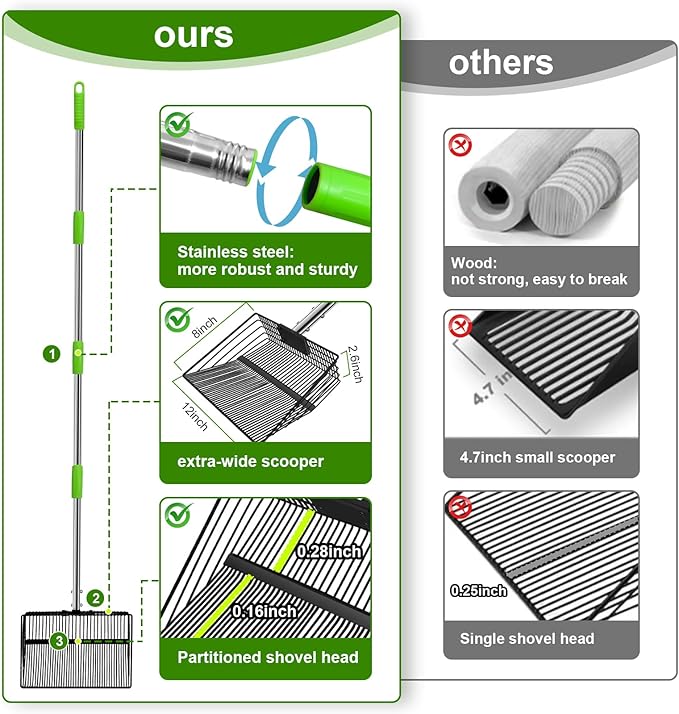 - [Easy to Assemble and Clean]: Just secure and connect the shovel head to the handle using anti-loosening screws, and the installation is complete.The structure is sturdy and won't loosen over time. The non-stick design reduces waste sticking to the chicken coop shovel, and a quick rinse with water is all it takes to clean it.