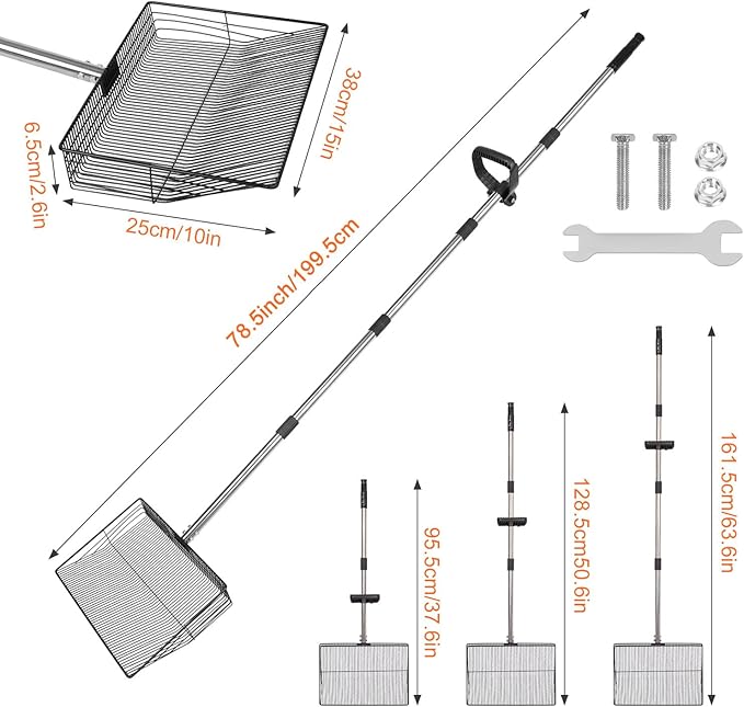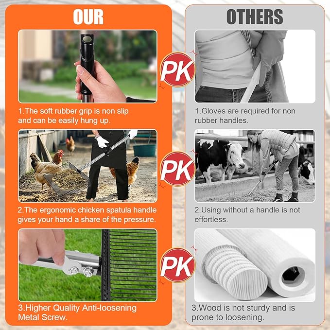 - Easy to Assemble & Clean: Comes with sturdy metal screws, so you can lock the scooper and handle firmly, no wobbling or loosening. Threaded joints let you adjust the chicken coop rake to different lengths in seconds for different tasks. unlike other poop scoopers, this chicken scooper never loosens with increased use. Besides, the smooth surface is easy to clean with just water flushing— zero stuck waste or no bacteria left