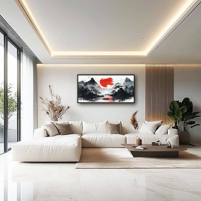 Framed Large Japanese Mountain Wall Art for Living Room, Oversized Asian Red Sun Lake Landscape Wall Decor Nature Canvas Painting Home Decoration for Living Room Bedroom Office 60"x30"