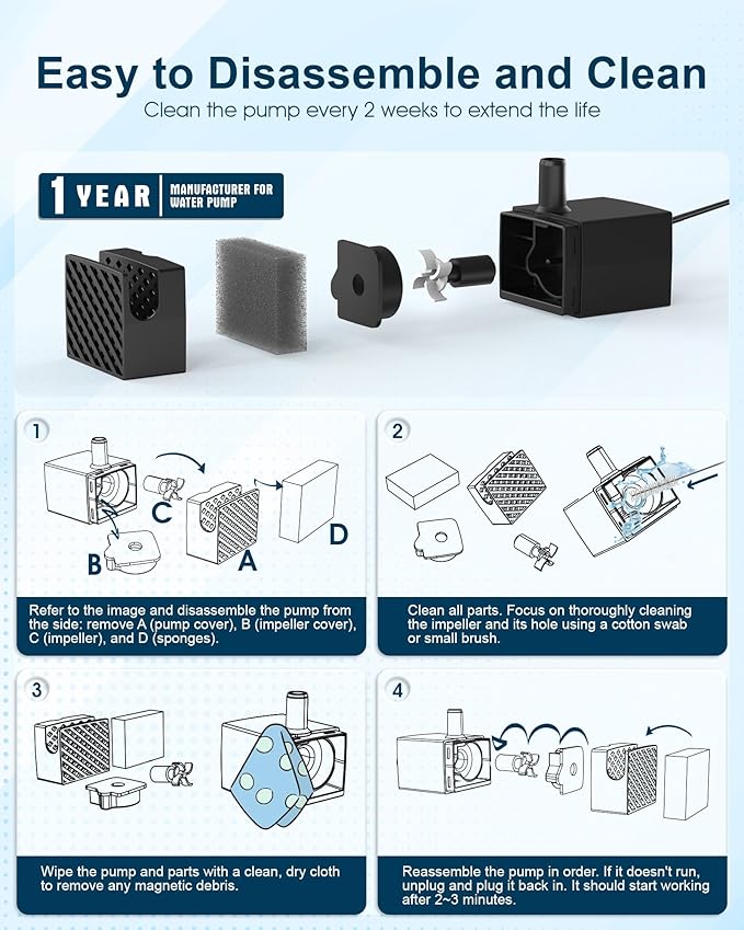 - Recommended Maintenance: To keep your water pump performing optimally and extend its lifespan, scan the QR code on the manual to watch the video and follow the cleaning instructions every 2 weeks. This helps prevent impurities from clogging the pump or reducing water flow. Cleaning frequency may vary based on usage and water quality, so adjust as needed