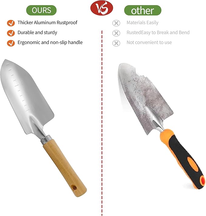 - 🌷DURABLE, HIGH-QUALITY HAND TOOLS – This set includes a hand trowel, transplanter, rake, fork, and weeder, all made from premium rust-resistant metal with ergonomic anti-slip handles to maximize comfort and durability.