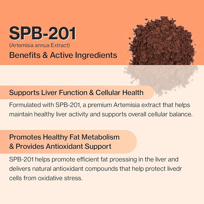- Powered by Artemisia annua (SPB-201) β natureβs antioxidant hero: Our formula features SPB-201, a premium extract of Artemisia annua (Sweet Wormwood), known for its powerful antioxidant and hepatoprotective properties. SPB-201 helps defend liver cells from oxidative stress and supports the bodyβs natural detoxification process, making it a key ingredient for long-term liver health.
