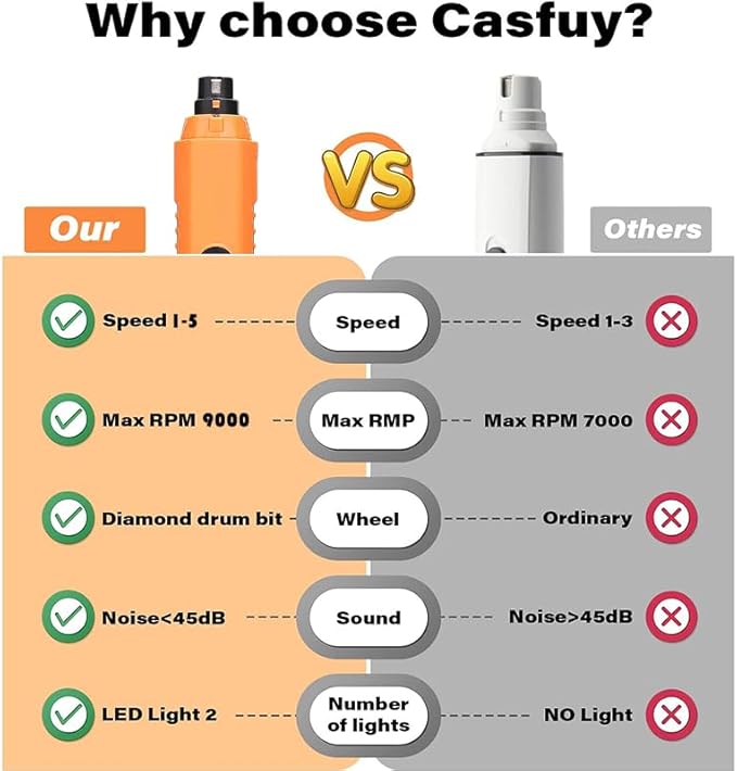 - 5-speed control+3 grinding ports: Customize pet trimming through adjustable speed (6000-9000 RPM) and 3 grinding ports suitable for small, medium, and large dogs. The upgraded motor is 40% more efficient and 60% quieter than standard nail filing tools.