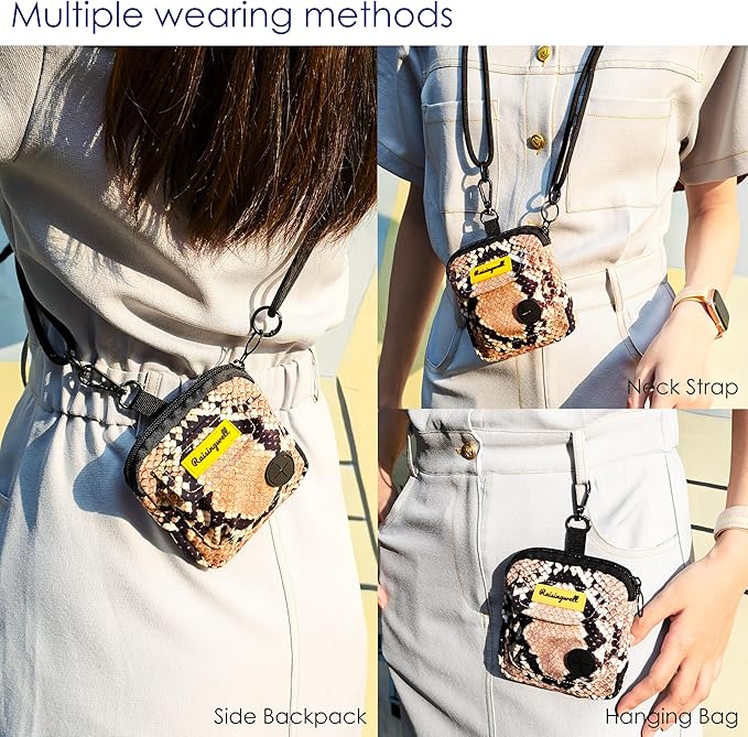 - Raisingwell Dog T1、Fashion Design: This dog training treat bag measures 4.9 x 5.1 inches and offers versatile wearing options. It comes equipped with a carabiner and a strap, allowing you to hang it on your leash, attach it to your pet's collar, or even wear it as a trendy accessory on your bag. The bag features a zipper closure, ensuring that treats stay secure inside even when you're playing with your pet afterward. It's perfect for carrying around or using during short outings.reat Pouch