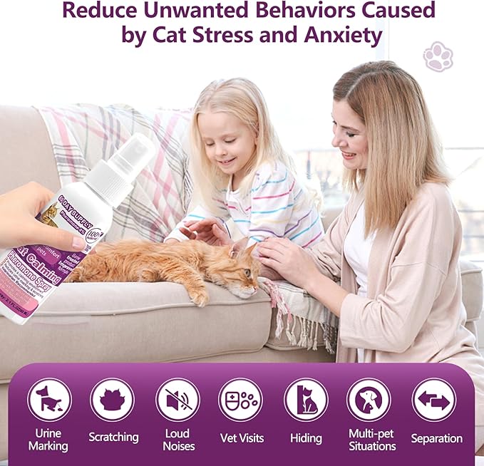 - EFFECTIVELY RELIEVE CAT ANXIETY: Effective for 90% of cats to reduce fighting with dog, scratching, urine marking, stop peeing, spraying, hiding, and other behavior among multi cats and kitten in the house. Cat Pheromone Spray can reduce cat stress during veterinary visits, travel, new environments, and loud noises (thunder, fireworks, etc.)