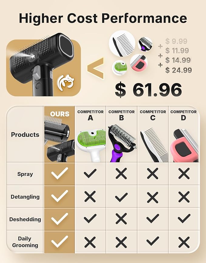 - [5-in-1 Multifunctional Cat Brush] WOWOOF PET cat brush integrates 5 different combs β one end is a floating hair comb with spray function, which can reduce static and floating hair. And it also has one-button hair removal function, easy self-cleaning. The other end is a 4-in-1 grooming rake. You can easily converse four different combs by rotation. Just one WOWWOF PET cat brush can meet all your pet's grooming needs. Higher cost performance