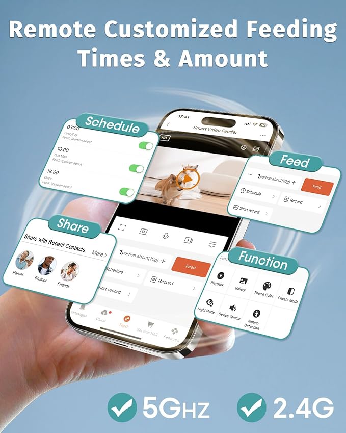 - HD Camera with Night Vision: Automatic dog feeder with camera monitor your petβs feeding process with the HD camera and night vision feature. Check food levels and ensure meals are completed in real-time. Whether day or night, this smart pet feeder gives you clear visuals to keep your petβs mealtime secure and monitored