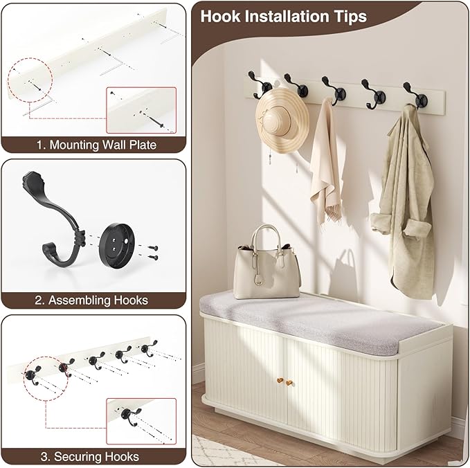 - Wall Hooks: This entry bench seat with shoe storage kit includes 5 metal hooks for hanging bags, clothes and umbrellas, which can be attached to the wall with the included boards, making it easy to keep everything you need for your outing in one place