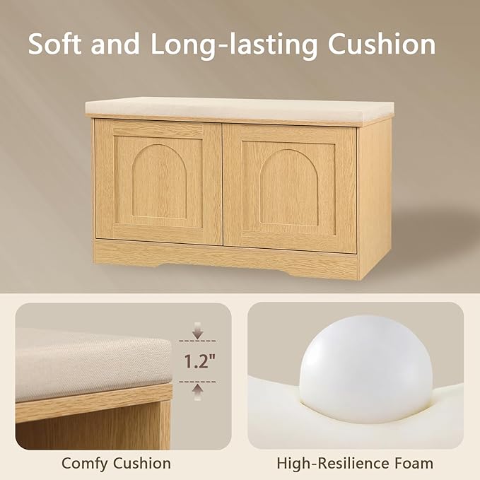 DINZI LVJ Shoe Bench, Entryway Storage Bench with Doors, Cushion, 2-Tier Shoe Rack with 6-Cubby, 31.5”L x 13.8”W Shoe Organizer Cabinet, Adjustable Shelf, Living Room, Bedroom, Natural