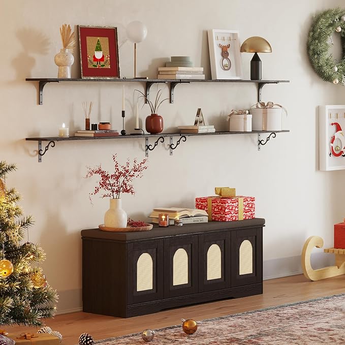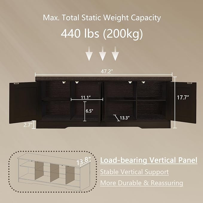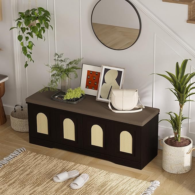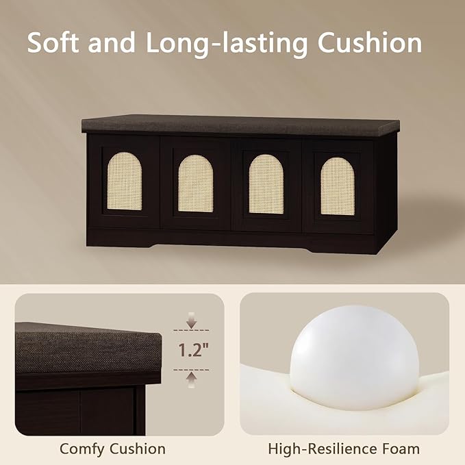 DINZI LVJ Shoe Bench, Entryway Storage Bench with Doors, Cushion, 2-Tier Shoe Rack with 8-Cubby, 47.2”L x 13.8”W Shoe Organizer Cabinet, Adjustable Shelf, Living Room, Bedroom, Espresso with Rattan