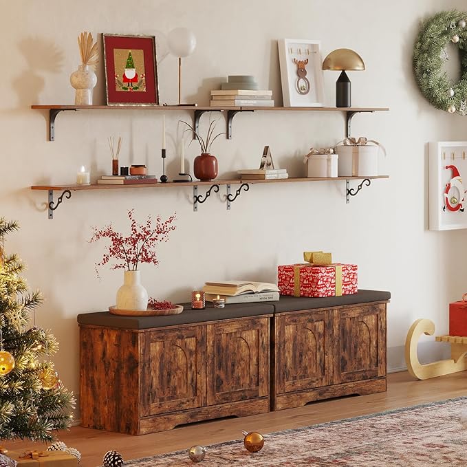 DINZI LVJ Shoe Bench, Entryway Storage Bench with Doors, Cushion, 2-Tier Shoe Rack with 6-Cubby, 31.5”L x 13.8”W Shoe Organizer Cabinet, Adjustable Shelf, Living Room, Bedroom, Rustic Brown