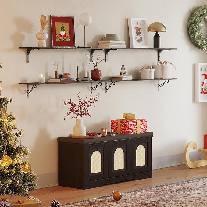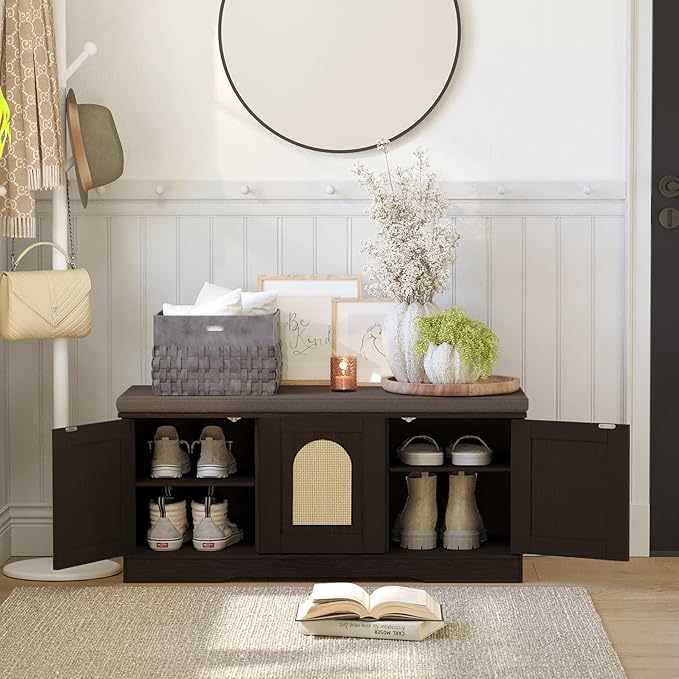 DINZI LVJ Shoe Bench, Entryway Storage Bench with Doors, Cushion, 2-Tier Shoe Rack with 6-Cubby, 39.4”L x 13.8”W Shoe Organizer Cabinet, Adjustable Shelf, Living Room, Bedroom, Espresso with Rattan