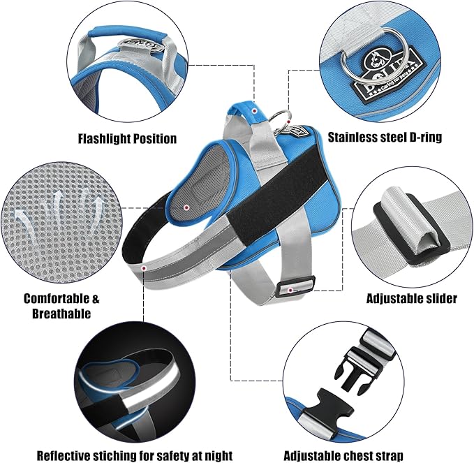 - OUTDOOR HEALTHY: Puppy no pull dog harness with reflective straps to ensure your dog is highly visible and keep dogs safe at night. You can connect the dog leash on the D-ring and with handle is easy to control on crowded streets. The high-end pet harness is perfect for daily walking, running, hiking, training, hunting, outdoor adventure and more!