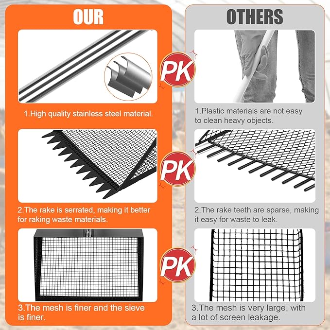 - 2 in1 Chicken Poop Scooper and Rake: First, you can use this chicken poop scooper to cleaning coops through sifting the poops from sand or wood chips in chicken coop. Then, this poop scooper can be used as a rake to clean chicken feathers, leaves or dead grass for a much cleaner coop environment for your animals. Save your money and energy