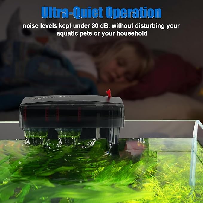 - WHISPER-QUIET OPERATION - Designed with advanced noise reduction technology, this small aquarium filter includes a water wheel that further minimizes sound. Operating at a quiet 30 decibels or lower, itβs perfect for bedrooms, offices, or any space where peace and quiet matter. Enjoy a serene environment without disturbing your aquatic pets or family, while still ensuring your tank stays clean and healthy. Ideal for those seeking a calm, noise-free filtration solution
